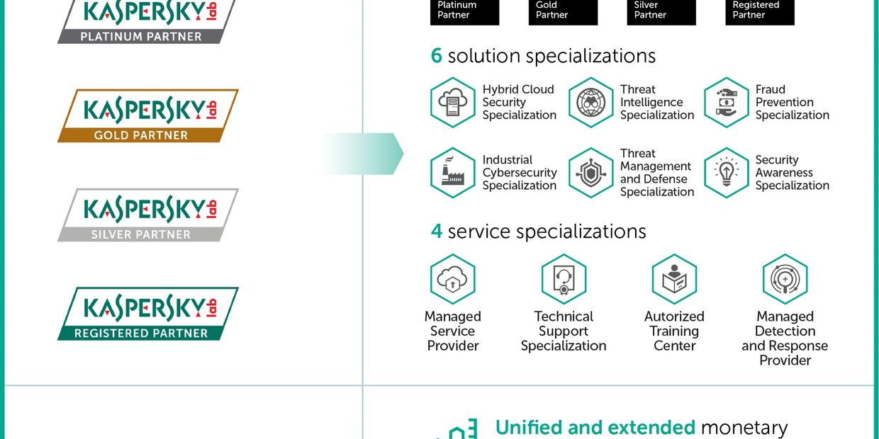 Through the Kaspersky United program, partners can maintain and monetize their specializations across different status levels (Registered, Silver, Gold and Platinum) in one or several domains: by solution (hybrid cloud security, threat management and defense, or fraud prevention), or by services, such as managed service provider, managed detection and response provider, or authorized training center.